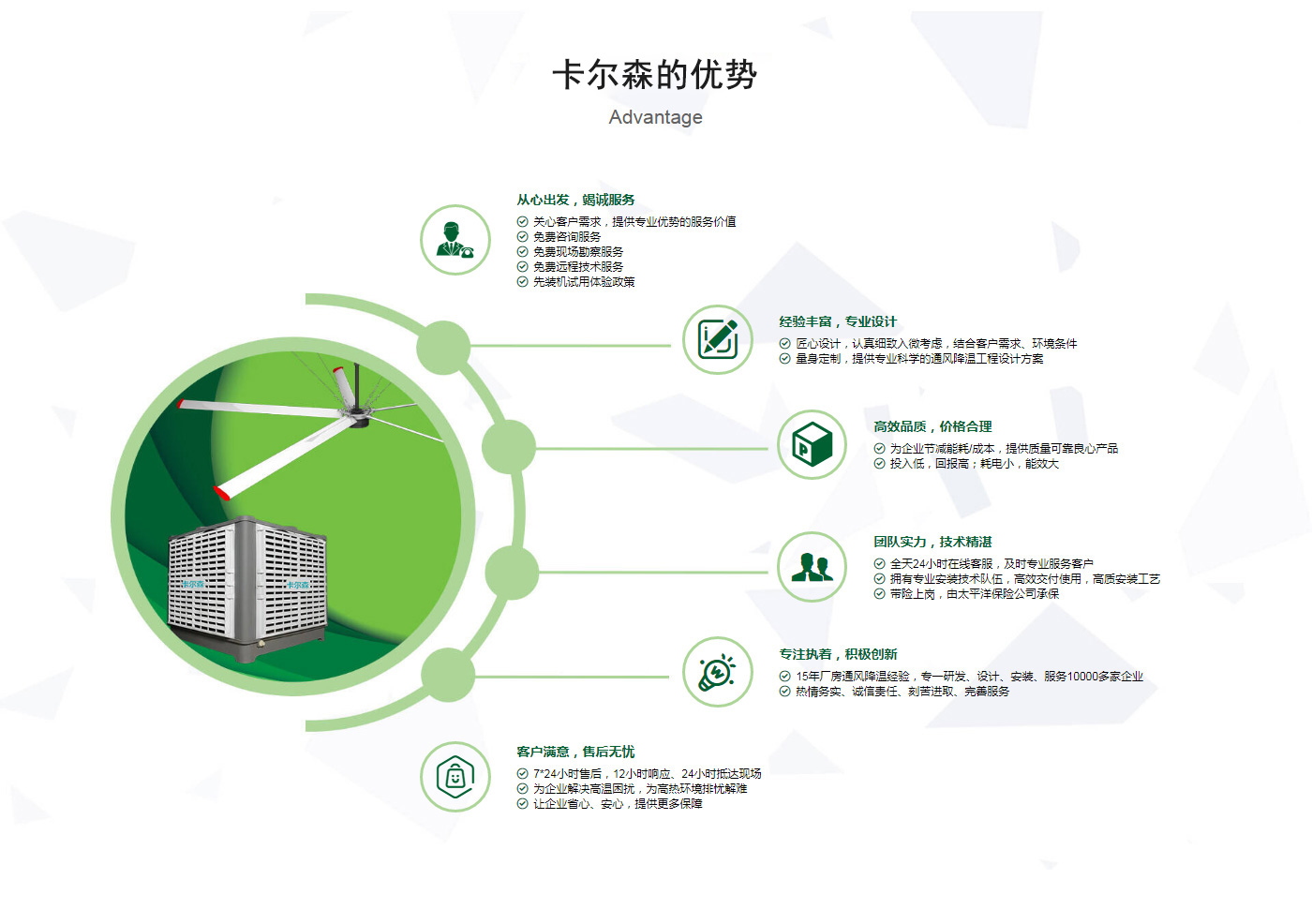??晉江市卡爾森機(jī)電設(shè)備有限公司是一家集設(shè)計(jì)、制作、銷售、安裝工業(yè)通風(fēng)設(shè)備、中央空調(diào)、節(jié)能環(huán)保空調(diào)、脈沖除塵設(shè)備、環(huán)境凈化工程、等環(huán)保工程企業(yè)。并提供環(huán)境影響評價、環(huán)保工程總承包、環(huán)保工程設(shè)計(jì)、環(huán)保工程運(yùn)營、環(huán)保工程成套設(shè)備等一站式服務(wù)。公司一直誠心服務(wù)于工業(yè)廠房的通風(fēng)設(shè)施,我們的產(chǎn)品:“品種齊全、質(zhì)量優(yōu)越”。根據(jù)客戶的需求精心設(shè)計(jì),高質(zhì)量的制造,力求使每個產(chǎn)品都達(dá)到合理耐用、節(jié)能環(huán)保。科學(xué)的設(shè)計(jì)和精美高品質(zhì)的產(chǎn)品,完善的服務(wù)系統(tǒng),加強(qiáng)售前、售中、售后服務(wù),對顧客在使用商品中出現(xiàn)的各種問題及時解決,使顧客無后顧之憂。產(chǎn)品廣泛適用于各類型制造業(yè)、機(jī)械類、五金冶煉、食品、化工、電子、紡織、噴涂、娛樂以及服務(wù)等場所。我們秉承“質(zhì)理過關(guān)、價格合理、交期準(zhǔn)時、服務(wù)周到”而受到新老客戶的好評和信賴。我們堅(jiān)持“客戶至上、質(zhì)量上乘”為宗旨,努力工作,為您換來潔凈美好的明天。卡爾森愿以過硬的質(zhì)量,良好的信譽(yù)同各界朋友一起開創(chuàng)更加輝煌的未來。